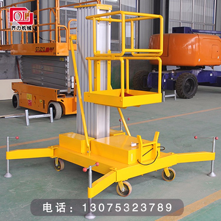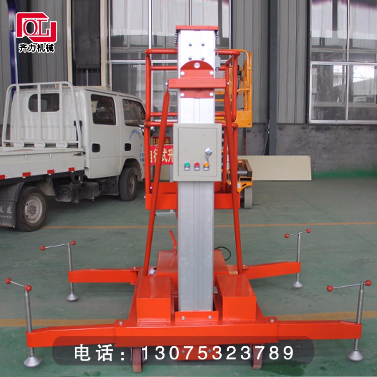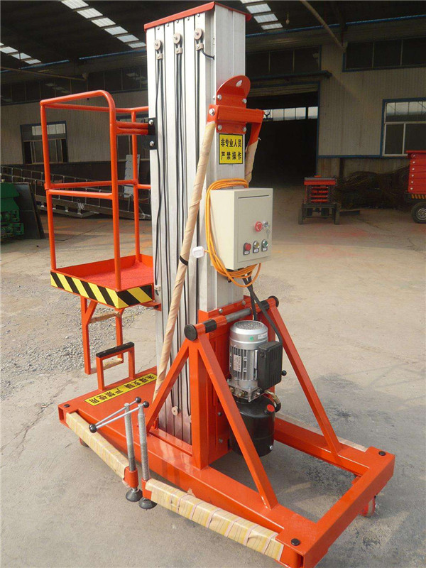單桅桿鋁合金升降機系列強化鋁合金桅桿設(shè)計,確保操作順暢及桅桿絕不變形,結(jié)構(gòu)精密緊湊,機身設(shè)計輕巧,所有液壓泵站及馬達均由歐美原裝進口,確保質(zhì)量超著。內(nèi)置后備電源及手動閥門設(shè)計,確保在斷電情況下可在平臺或地面使控制平臺下降,機身底座設(shè)有活動輔助輪,提供良好的拐彎性能,以及輕易跨越一般的地面障礙,單桅桿機種設(shè)有貨車裝卸輔助裝置,可雙人進行裝卸。起重鏈條負荷**系數(shù)大小于10:1,并設(shè)有鋼絲**保護系統(tǒng),確保升降順暢**,支撐腳占地特小,安裝后平臺離墻距**是0.34米,方便作業(yè)。